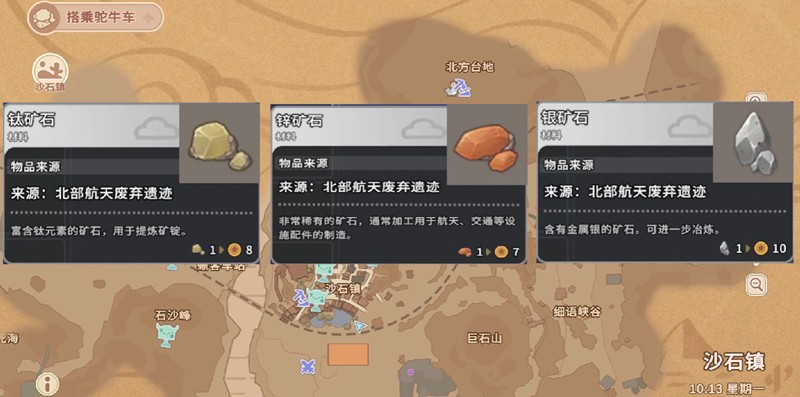 北部航天废弃遗迹是沙石镇时光中一个重要的稀有物品获取地点,玩家可以通过驼牛车前往该区域。这里主要产出钛矿石、锌矿石和银矿石,这三种矿石都是游戏中较为稀有的资源。同时,遗迹内还会随机掉落光能磁盘、青铜碎片等稀有物品。进入该遗迹需要支付250金币的门票费用,且没有时间限制,玩家可以多次进入挖掘。