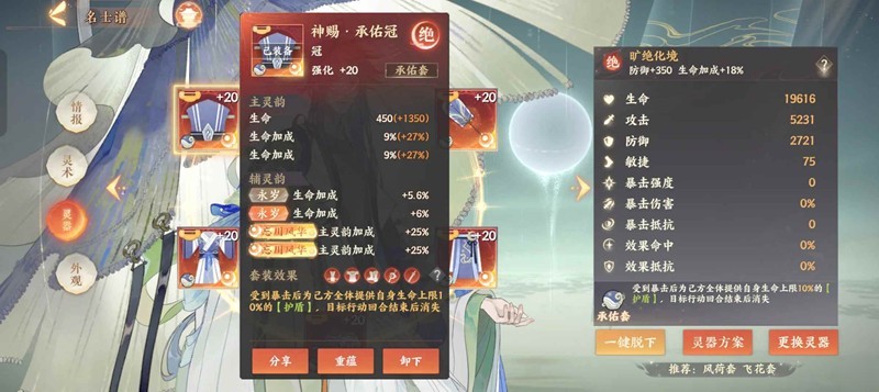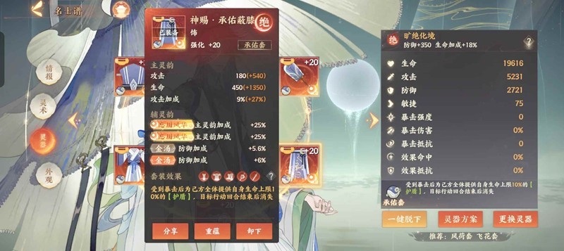 装备方面选择飞花风荷承佑,偏输出可以飞花搭配苍灰星魂,偏治疗可以风荷搭配藤黄蟹蟹,这两套都没有的话,承佑也是一样可以使用的。