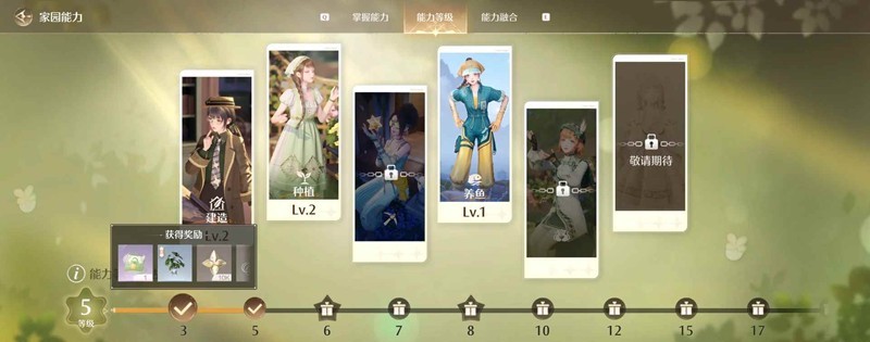 在能力升级那边领取3级的奖励,就可以回掌握能力那边再三选一解锁一个能力(采星/养鱼/动物邀约都可以,具体选哪个主页另一篇有详细分析)另外每天可以最多获得100家园心得,可以再选一个能力升到2级(不建议优先升建造能力,先升其他能赚钱的能力好一些)up推荐升种植
