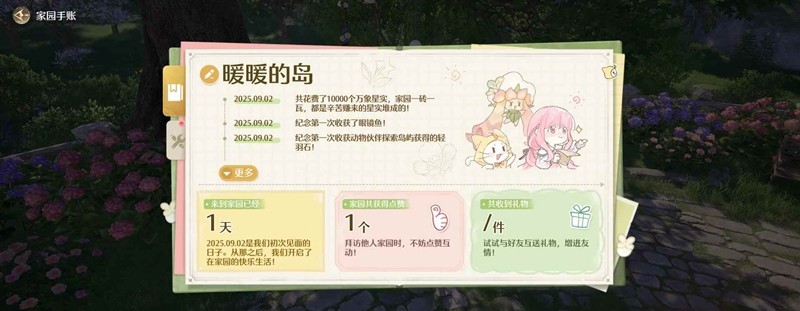 园宝收购就是把种的东西卖钱,目前不建议急着卖可以等等攻略。家园手帐里面可以改岛名,以及随进度领很多万象星实。乐园构想在美鸭梨或者右上角按钮打开,蓝钻解锁送一个家具+设计图+双倍代币,完成一定任务后蓝钻全额返还。
