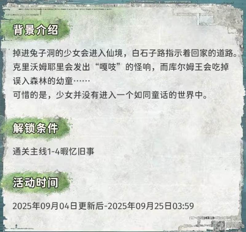 在此次活动中,玩家将跟随掉进兔子洞的少女,进入一个名为仙境的地方。白石子路指引着回家的方向,但克里沃姆耶里会发出“嘎吱”的怪响,而库尔姆王会吃掉误入森林的幼童。然而,少女并没有进入一个如同童话般的世界中,而是面临着未知的挑战。