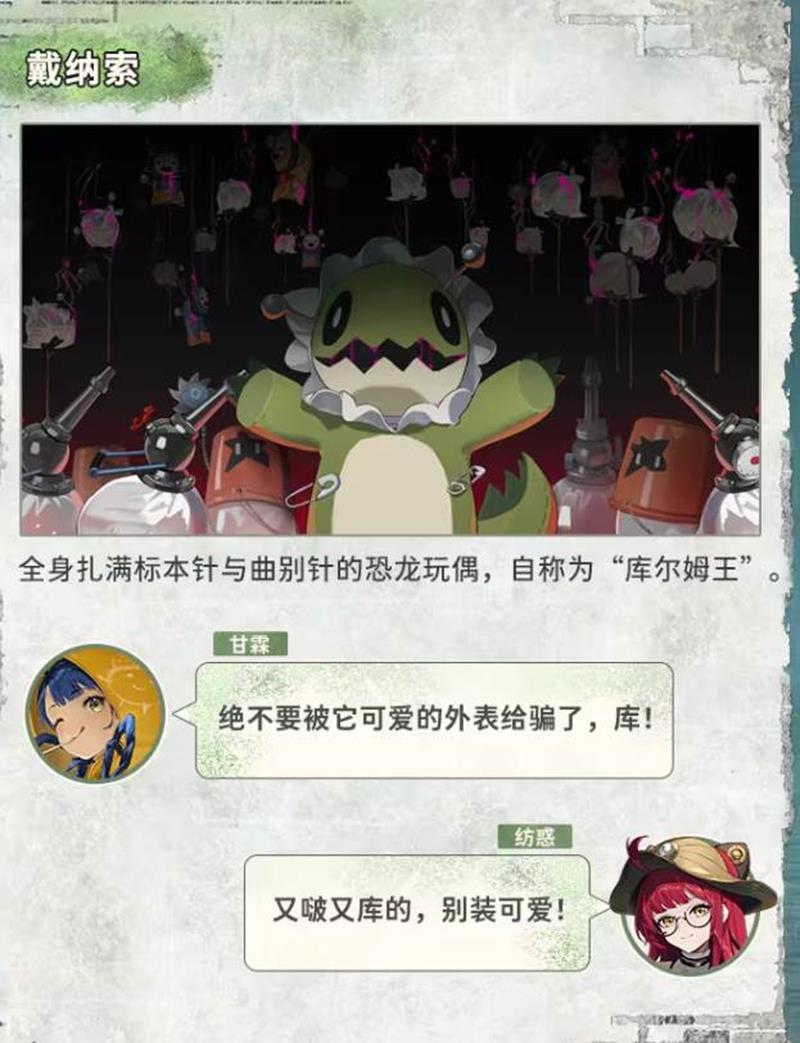 戴纳索:全身扎满标本针与曲别针的恐龙玩偶,自称为“库尔姆王”。玩家需要小心,不要被它可爱的外表所欺骗。