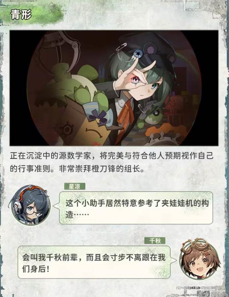 角色介绍:青形:正在沉淀中的源数学家,将完美与符合他人预期视作自己的行事准则。非常崇拜橙刀锋的组长。甘霖:提醒玩家晚上熄灯后的幼稚园确实很瘆人,恐怖向跑团专属场地出现了。星凉:提到这个小助手居然特意参考了夹娃娃机的构造。千秋:会叫我千秋前辈,而且会寸步不离跟在我们身后!