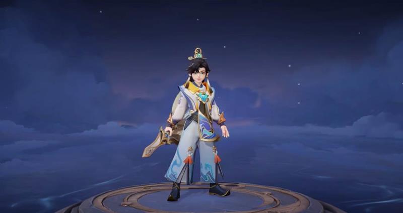 整体以清新淡雅的月白与青蓝色调,营造出曹植作为文人宁静致远的气质,同时以橙黄色作为镶边点缀,增加了些许华贵气息。服饰设计元素以蓝白祥云纹样为主,清新而不失优雅。利落的束发搭配精致的玉石发冠,胸口处戴有祥云状的玉石挂饰。身后的披风如书页般折叠在地,契合曹植文人雅士的身份。
