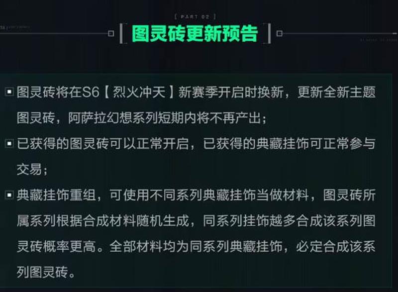 活动内容:S6【烈火冲天】新赛季开启时,将更新全新主题图灵砖,阿萨拉幻想系列短期内将不再产出。已获得的图灵砖可以正常开启,已获得的典藏挂饰可正常参与交易。典藏挂饰重组,可使用不同系列典藏挂饰当做材料,图灵砖所属系列根据合成材料随机生成,同系列挂饰越多合成该系列图灵砖概率更高。全部材料均为同系列典藏挂饰,必定合成该系列图灵砖。