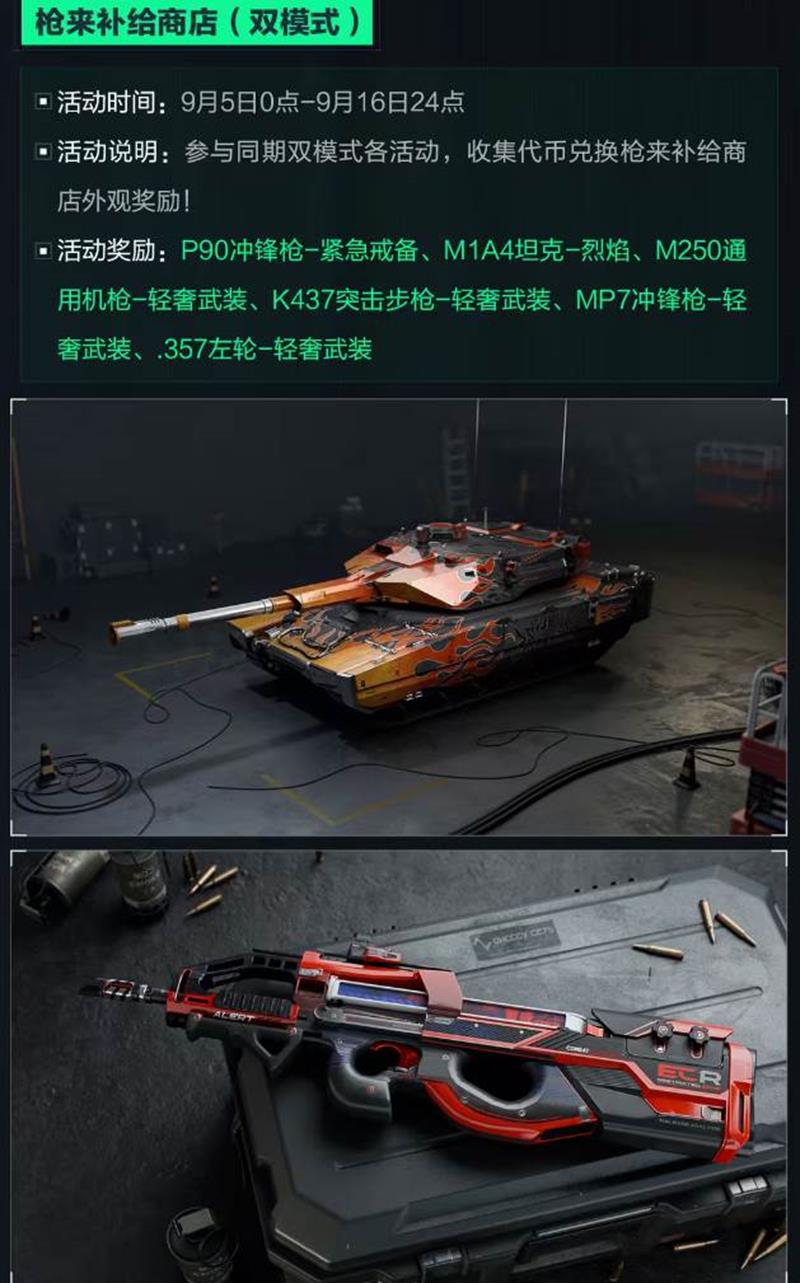 活动奖励:P90冲锋枪-紧急戒备、M1A4坦克-烈焰、M250通用机枪-轻奢武装、K437突击步枪-轻奢武装、MP7冲锋枪-轻奢武装、.357左轮-轻奢武装。