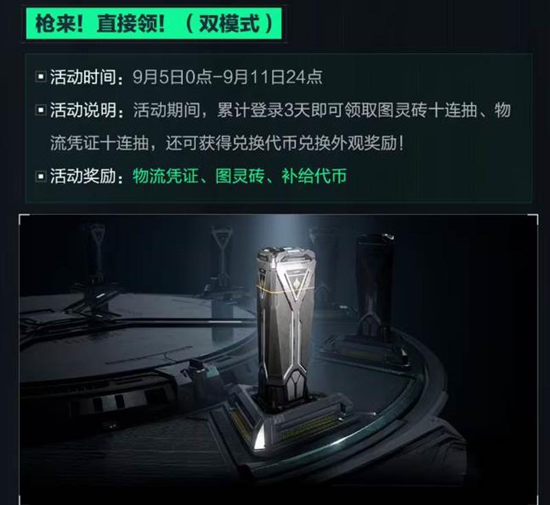 活动说明:活动期间,累计登录3天即可领取图灵砖十连抽、物流凭证十连抽,还可获得兑换代币兑换外观奖励。