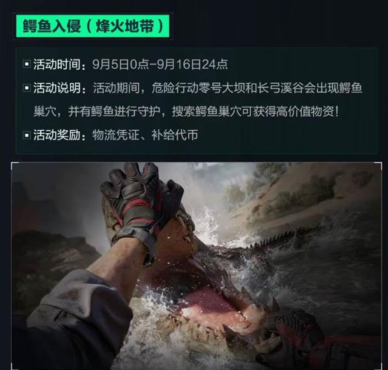 活动说明:活动期间,危险行动零号大坝和长弓溪谷会出现鳄鱼巢穴,并有鳄鱼进行守护,搜索鳄鱼巢穴可获得高价值物资。