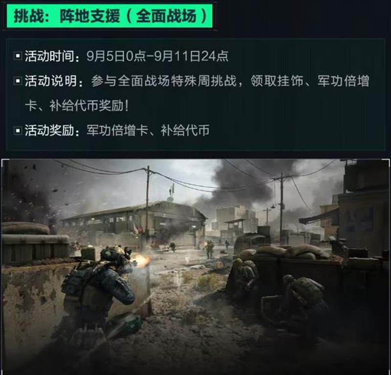 活动说明:参与全面战场特殊周挑战,领取挂饰、军功倍增卡、补给代币奖励。
