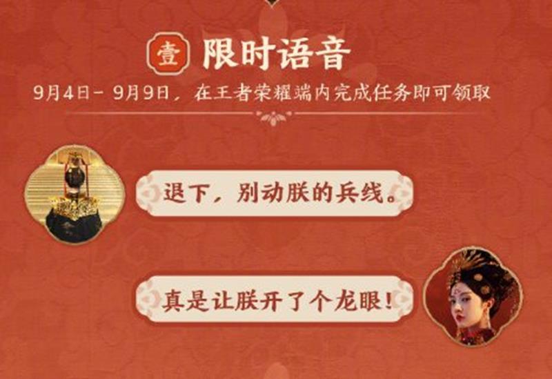 1.限时语音:【退下,别动朕的兵线】(30日)【真是让朕开了个龙眼】(30日)