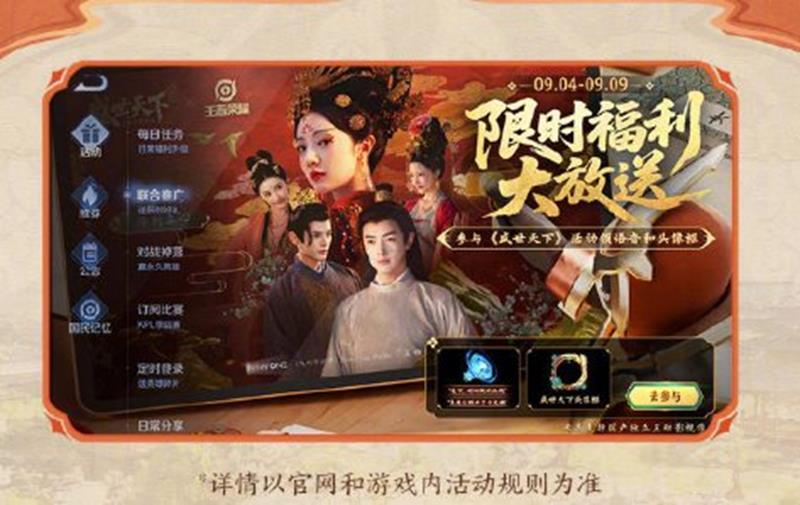 王者荣耀与《盛世天下》的联合推广活动,不仅为玩家们带来了丰富的游戏内奖励,还让大家有机会体验到宫廷生存互动影视作品的魅力。赶快参与活动,赢取你的专属奖励吧!