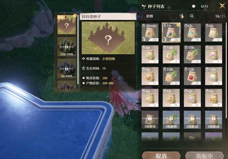 我们选择3级种植解锁的铃铃草,种下8块之后全部使用滋养甘露立即成熟,成本共计2400。