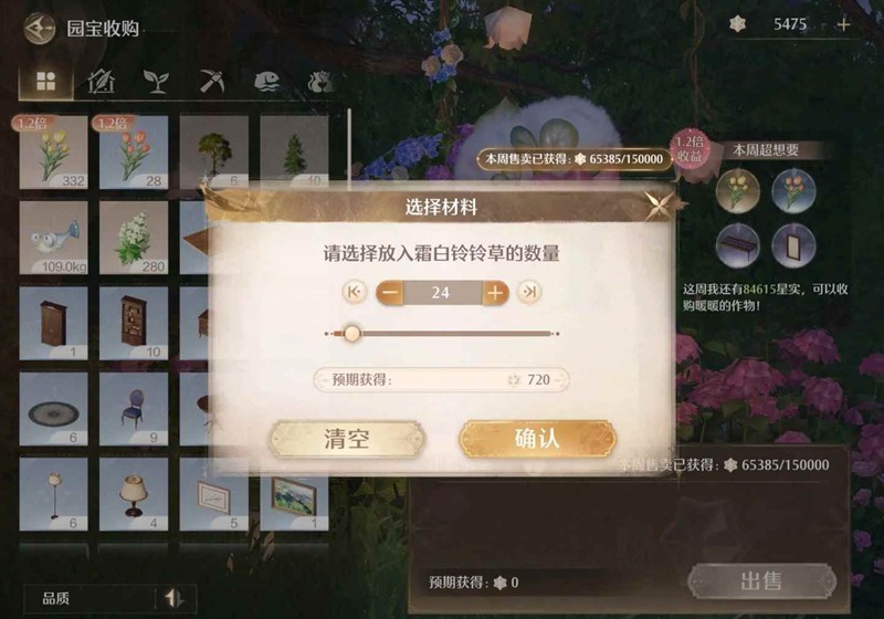 这个计算不太严谨,实际上是白色草固定产出10个,蓝紫色分别是8和6个,实际利润为180)而考虑到种植收获大量铃铃草之后可以定向种植紫色铃铃草,此时卖出收益为2880,如果遇上1.2倍收购则是3456,净赚1056!如果再加上种植7级和9级的10%售价加成,想都不敢想