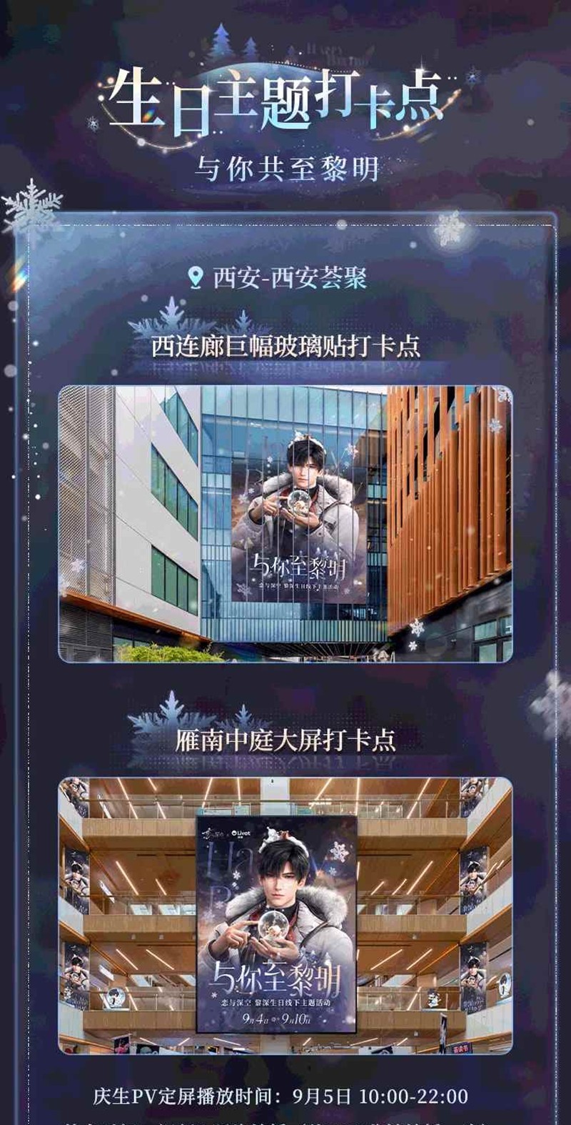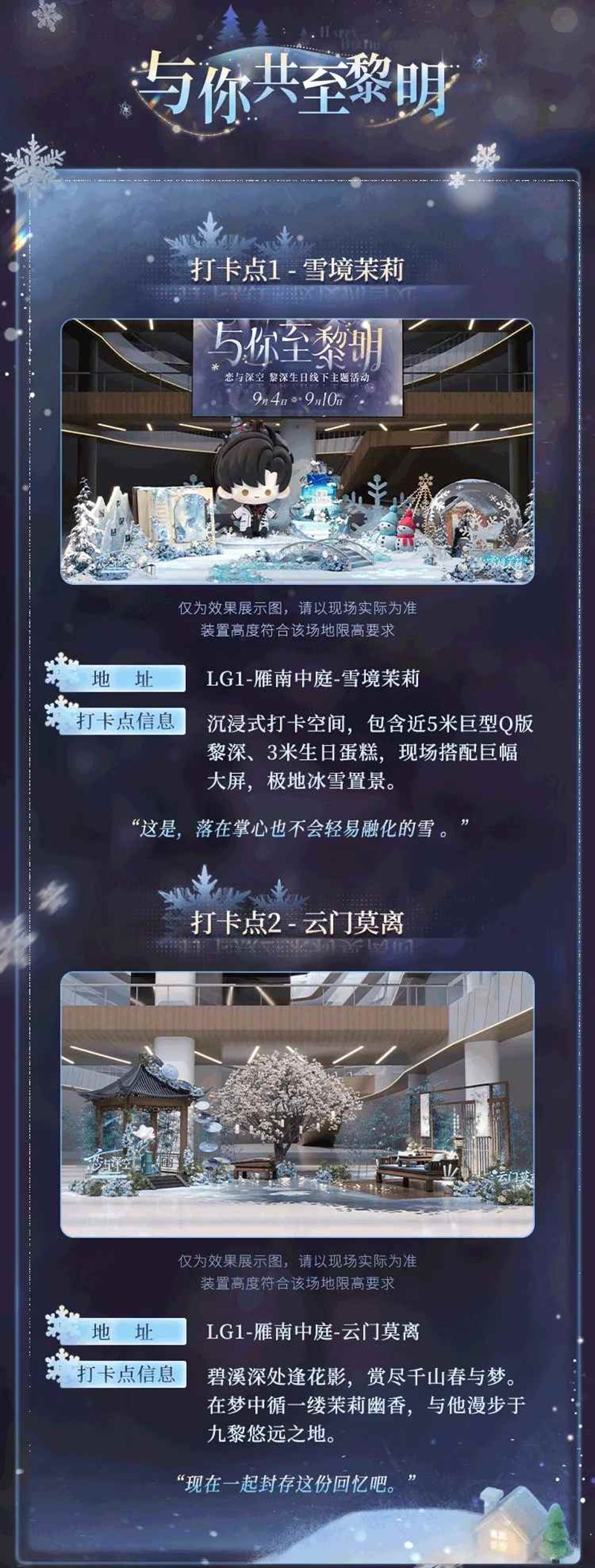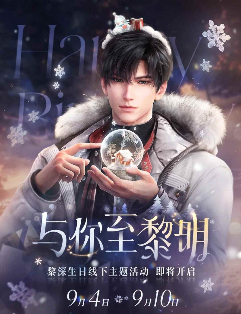 「与你至黎明」黎深生日主题线下活动今日已开启~极夜拥雪,茉莉弥香,与他共守长夜尽头的黎明时分。「与你至黎明」黎深生日主题线下活动公开!2025年9月4日~10日,现场还设置有主门头、场内大屏、主题吊旗、主题生日打卡墙、主题Q版贴、主题生日挂布等多个惊喜点位,和他同度极夜,共至黎明。