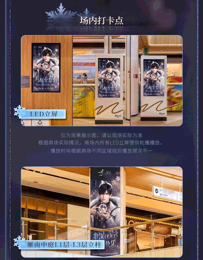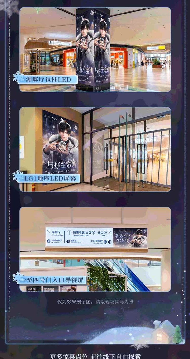 现场还设置有主门头、场内大屏、主题吊旗、主题生日打卡墙、主题Q版贴、主题生日挂布等多个惊喜点位,和他同度极夜,共至黎明。