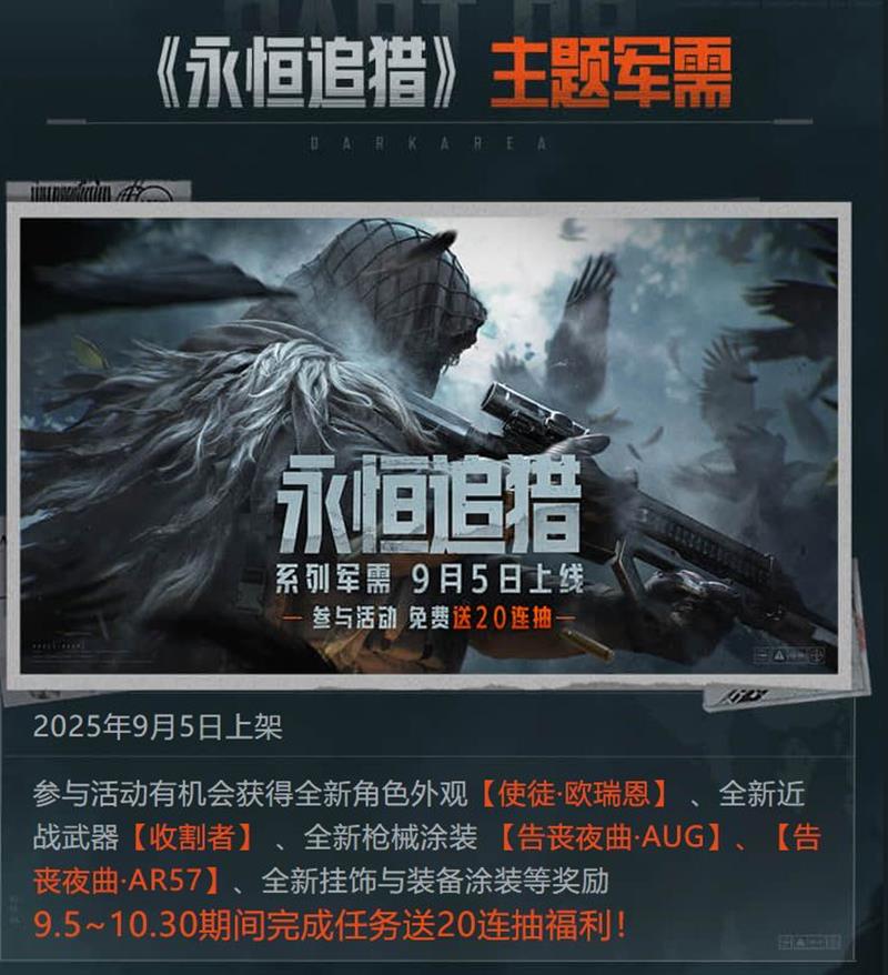 全新挂饰与装备涂装等奖励:9.5~10.30期间完成任务送20连抽福利!
