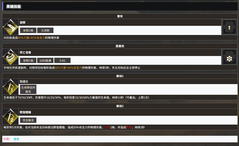 粉碎者的普攻“竖劈”是积累能量的主要方式,每次攻击回复约80点能量。而能量技“死亡龙卷”需要1000能量、冷却9.8秒,手持巨斧旋转5秒,对相邻目标每秒造成60%力量+45%攻击力的物理伤害。该技能是核心输出手段,配合90级左天赋“伤害减免+50%”可在人群中站桩输出,150级双天赋进一步强化其生存与能量回复。