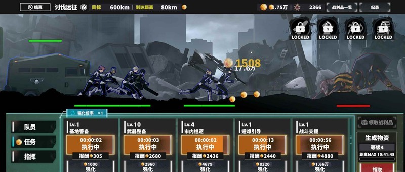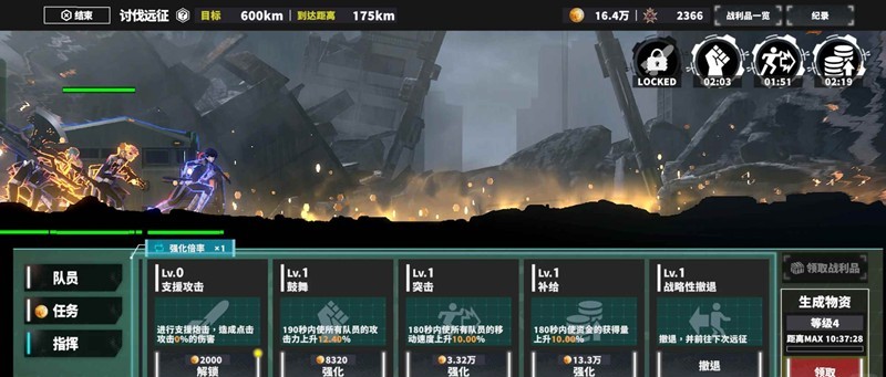 总结:回收的战利品开启越多,buff叠越多,更容易到达更高KM,后期能打更高km的时候,感觉打不过的时候就离线挂机久一点,然后升任务,人物等等,升完还是打不过,继续点左上角,继续挂久点。