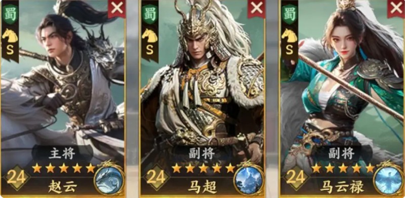 赵云、马超、马云禄构成的连击铁骑是极具视觉冲击力的配置,纯骑兵队伍充分发挥了机动作战的优势。赵云自带移速加成,使整支部队行动迅捷;马超根据速度差提升伤害,冲锋时更具威力;马云禄的双重普攻触发机制让实际输出远超常规部队。使用此阵容需注意战场地形,开阔地带能最大化发挥骑兵优势,狭窄关口则需提前调整站位。