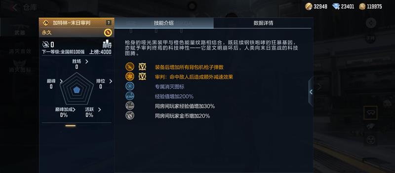 另一个比较出色,为审判:命中敌人后造成额外减速效果,这个技能在挑战模式中表现效果较弱,但十分适合生化党定点生存,如果是生化党建议入手,适合生化模式喜欢据守一处的玩家使用,妥妥生化党才用考虑的武器。