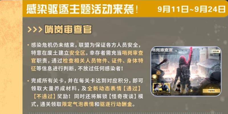 玩家需要担任哨岗审查官,通过检查相关人员物品、证件、身体特征等信息进行判断,完成所有关卡并达到对应积分,即可领取奖励。