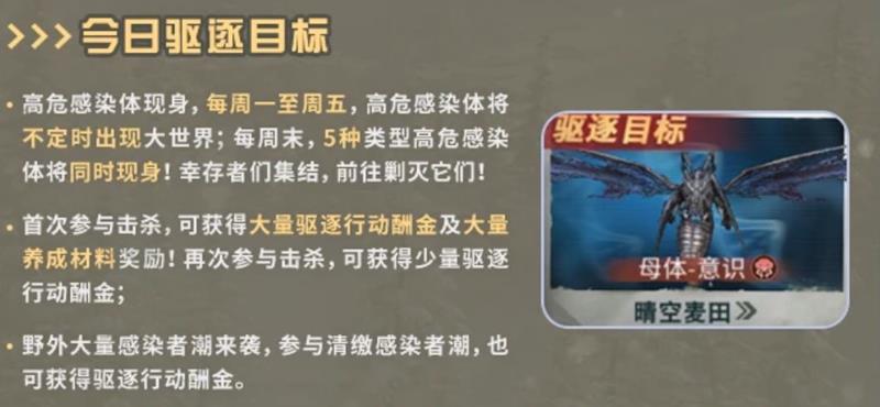 每周一至周五,高危险感染体将不定时出现,玩家需要前往剿灭它们。首次参与击杀可获得大量驱逐行动酬金及材料奖励。