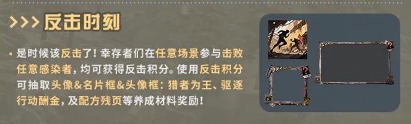 在任意场景参与击败任意感染者,均可获得反击积分,使用反击积分可抽取头像框、头像框、驱逐行动酬金等奖励。