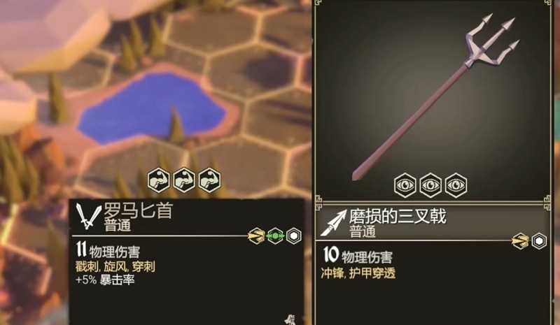 装备方面,角斗士会携带罗马匕首、木制碟形圆盾和磨损的三叉戟。常规作战时多以罗马匕首为主,它提供的暴击率可有效地提升角斗士的整体输出,三种招式中的旋风还具备不错的溅射伤害,配合上初期就拥有强力群伤的角色,能十分快速地完成开荒工作,并为队伍积攒下丰厚的资源用于后期的养成。倘若在单怪环境下,都为单体招式的三叉戟则会在实战里表现更佳。而木盾则是会提供一个敌人嘲讽的特效。
