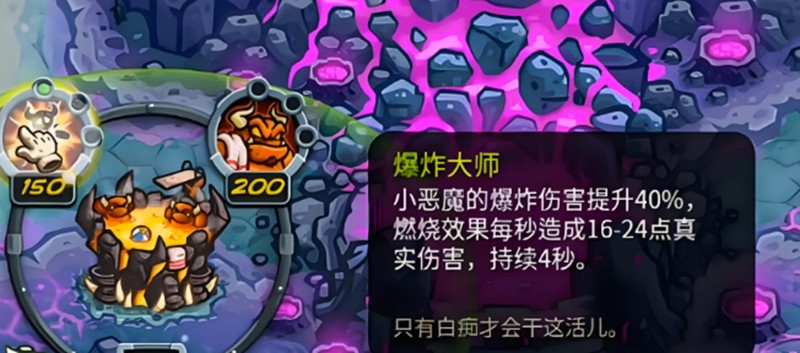 恶魔熔坑的主要技能围绕小恶魔和大恶魔的召唤展开。小恶魔可以在一定范围内造成爆炸伤害,并且每秒对敌人施加16到24点真实灼伤,持续4秒。升级后还能提升40%的爆炸伤害,使其在面对高血量敌人时依然具备不错的压制力。而大恶魔则可以作为前排拦截单位,有效延缓敌人的推进速度,同时冷却时间较短,适合频繁使用。