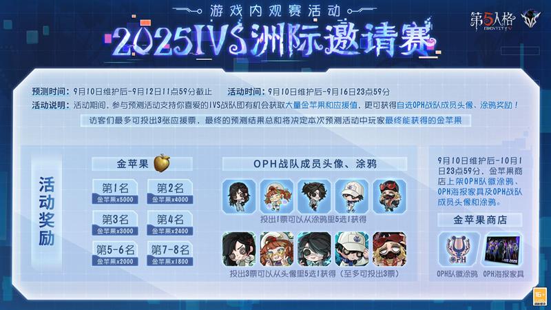 第五人格2025 IVS洲际邀请赛游戏内预测活动将于明日正式启动。这不仅是一场智力与运气的较量,更是一次赢取丰厚福利的绝佳机会。参与活动,为你支持的战队加油助威,赢取大量金苹果、应援值,以及OPH战队专属头像、涂鸦、海报家具等限定奖励。