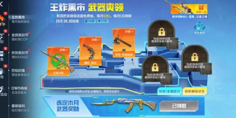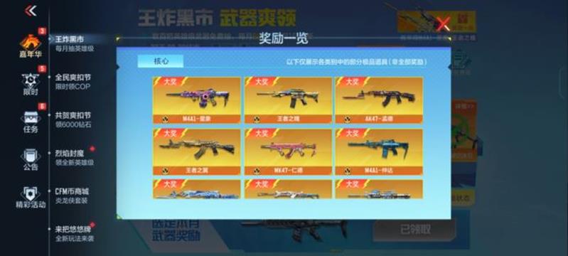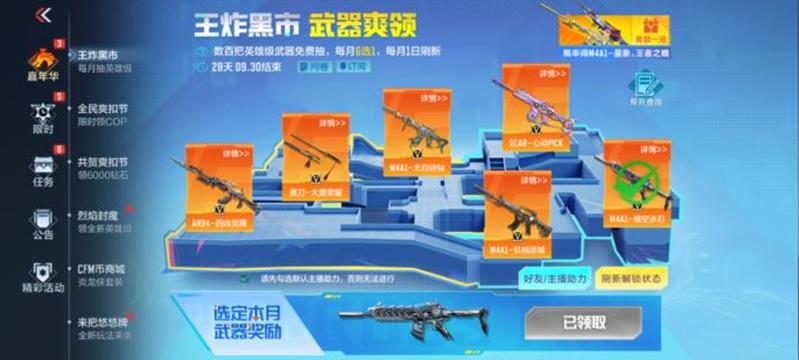 哈喽各位CFer大家好,王炸黑市已经上线正式服活动版块,数百把英雄级武器免费抽,每月6选1,每月1日刷新。各位在九月都刷新到哪六把武器呢?在这六把中是否有你喜欢的或者没有的武器呢?听说核心奖励里面还有诸多三国武器,本期资讯便随我一起来了解一下。