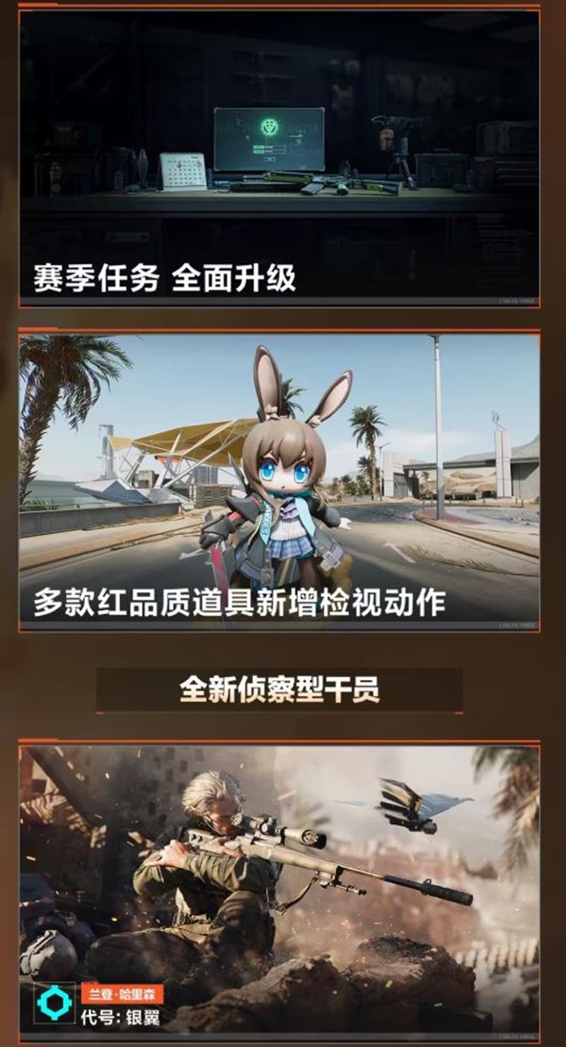 多款红品质道具新增检视动作,全新侦察型干员代号“银翼”的兰登·哈里森将加入战场,为玩家提供新的战术选择。同时新的武器将为玩家提供更多的战斗选择,增强战斗的多样性。