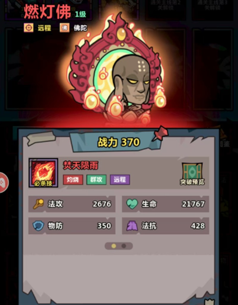 弥勒佛是妖怪金手指中非常值得培养的角色之一,他作为远程佛陀,拥有强大的控制与输出能力。他的必杀技如来神掌可以对最近的敌人造成高额伤害,并有概率让敌人陷入眩晕状态,有效打断敌方进攻节奏。降魔神掌则具备穿透效果,能够破坏敌人的防御,而大金刚印则能在受到攻击时触发眩晕,提升队伍的防守反击能力。