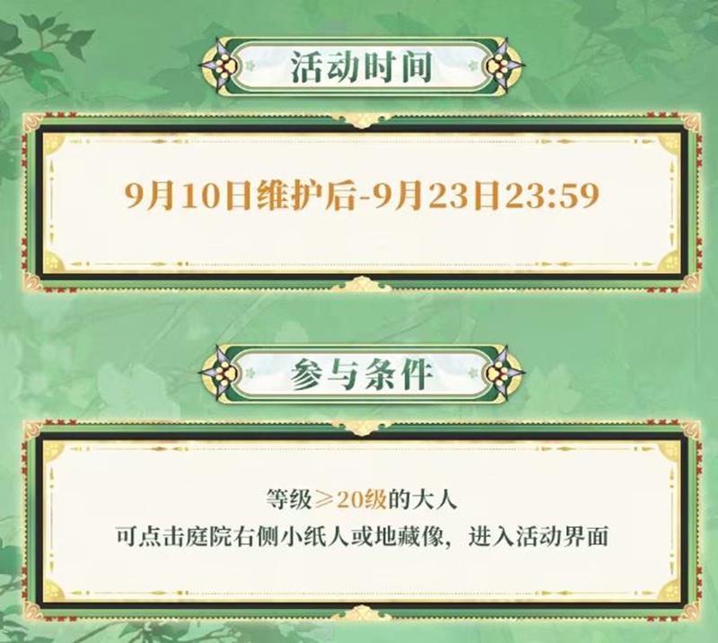 活动时间从9月10日维护后开始,一直持续到9月23日23:59。参与条件为等级达到20级的阴阳师大人,可以通过点击庭院右侧小纸人或地藏像进入活动界面。