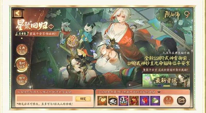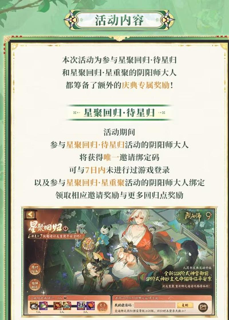 阴阳师九周年庆典即将到来,为了迎接这一重要时刻,游戏特别推出了“星聚回归”活动,为回归的阴阳师大人们准备了丰富的福利和特权。本次活动旨在让每一位重返平安京的阴阳师都能享受到专属的庆典体验。