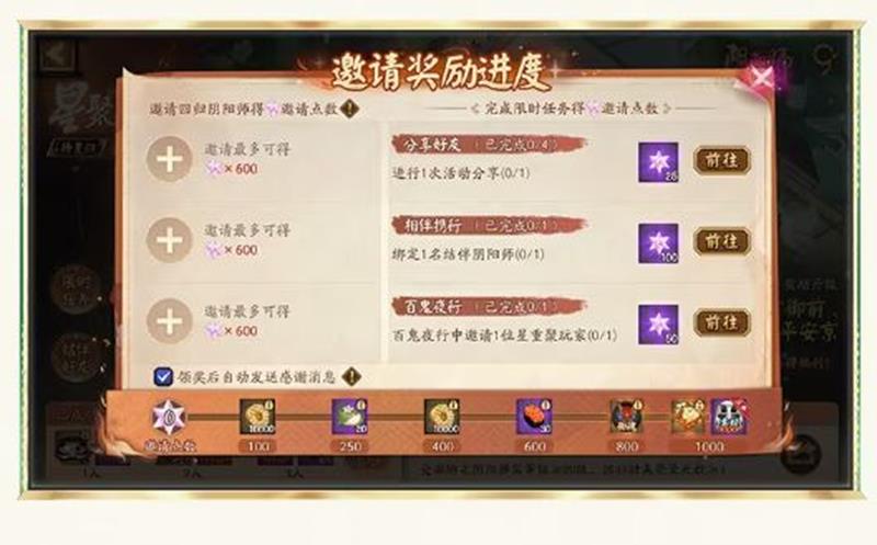 参与星聚回归活动的阴阳师大人将获得唯一的邀请绑定码,可以与7日内未进行过游戏登录的阴阳师大人以及参与星聚回归活动的阴阳师大人绑定,领取相应的邀请奖励与更多回归点奖励。