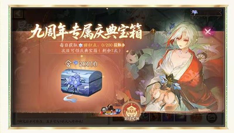 周年庆特别活动期间,参与星聚回归·星重聚活动的阴阳师大人若当日获得200回归点,则第二天可领取九周年专属“庆典宝箱”。总回归点达到600点后,每日登录,次日即可领取“庆典宝箱”,总共可以领取7次。