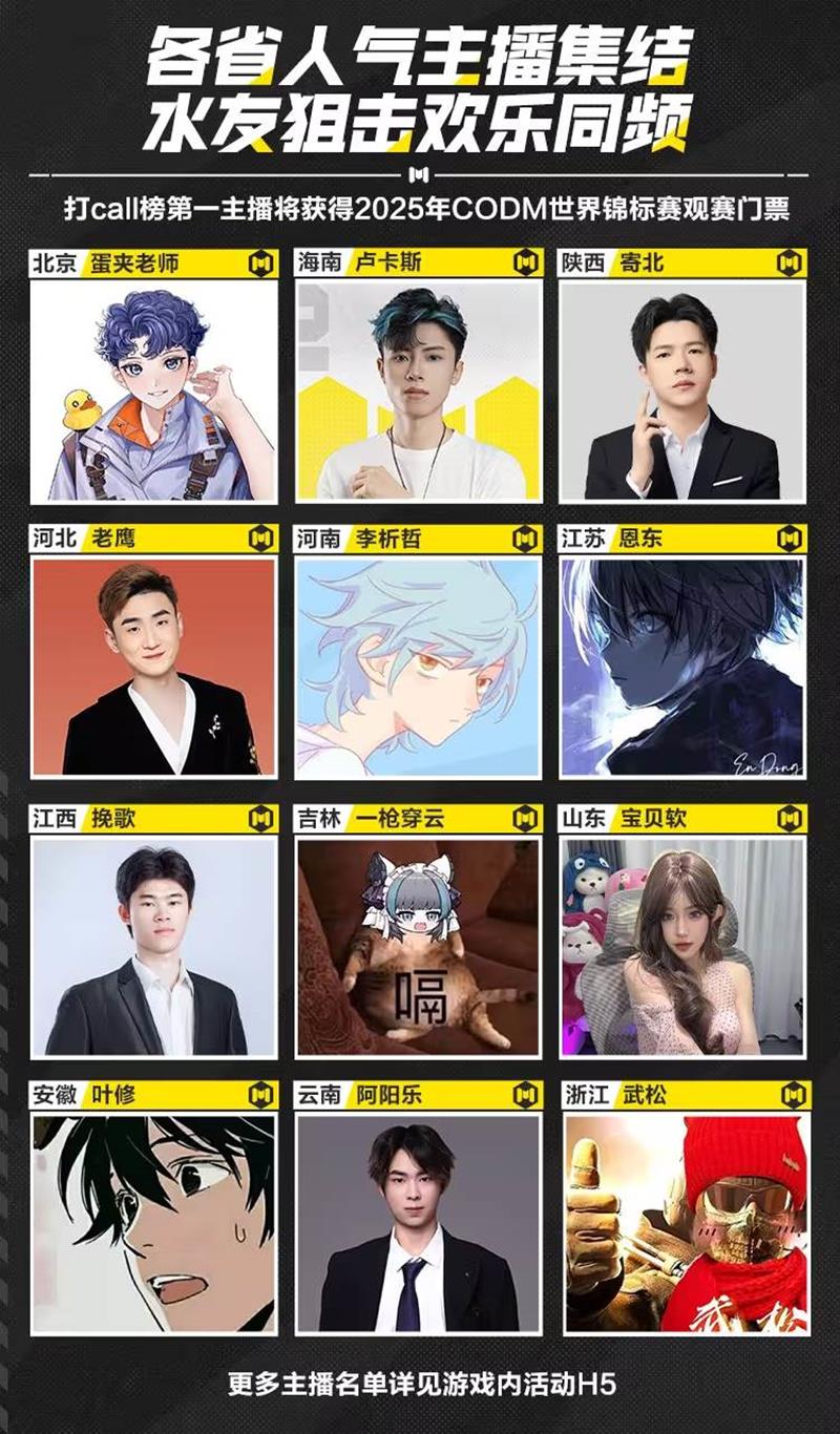 各省人气主播已经集结,他们将为家乡代言,参与到这场激烈的赛事中。打call榜第一的主播将获得2025年CODM世界锦标赛观赛门票。