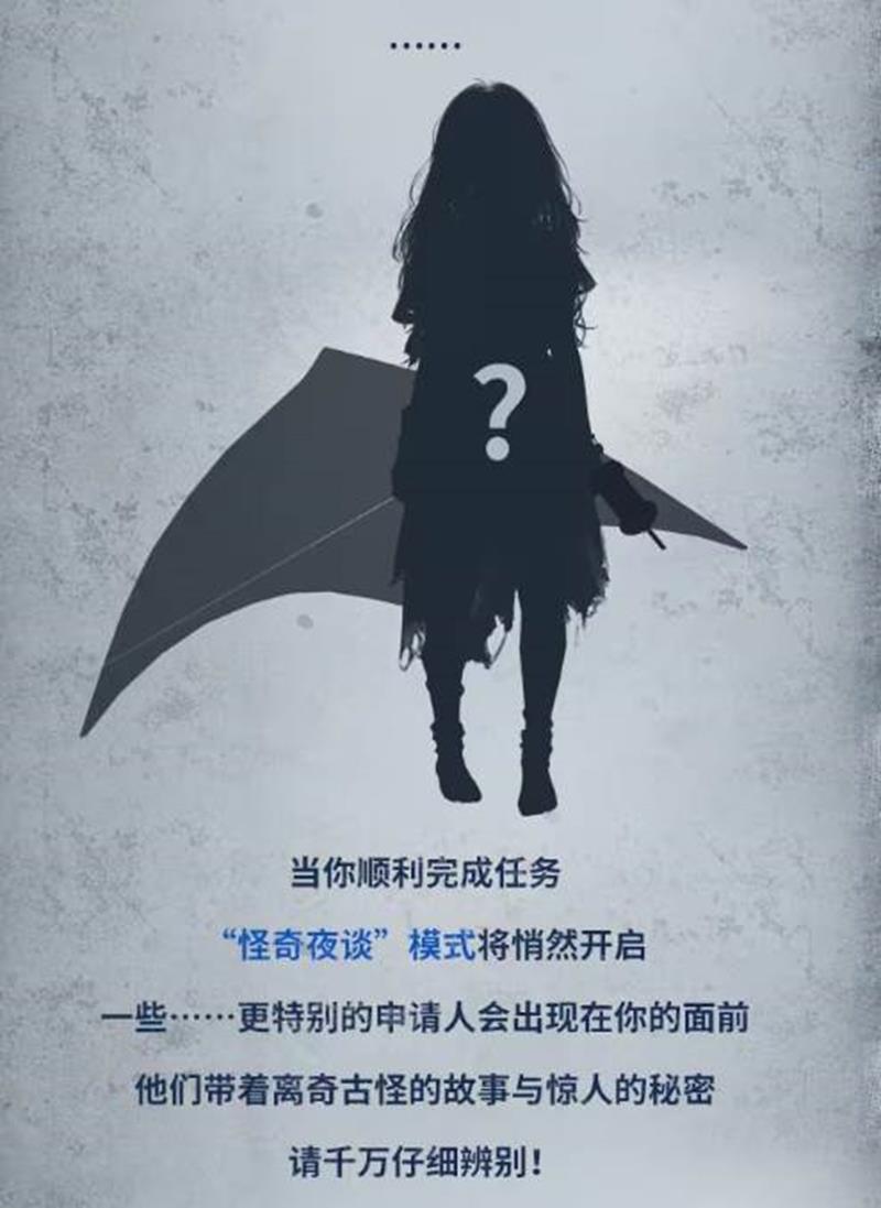 顺利完成任务后,将开启“怪奇夜谈”模式,玩家将遇到一些特别的申请人,他们带着离奇古怪的故事与惊人的秘密。