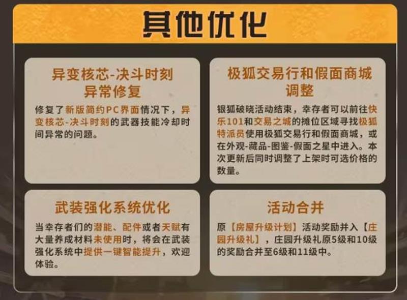 其他优化修复了新版简约PC界面下,异变核芯-决斗时刻的武器技能冷却时间异常的问题。优化了极狐交易行和假面商城。武装强化系统优化,提供一键智能提升。
