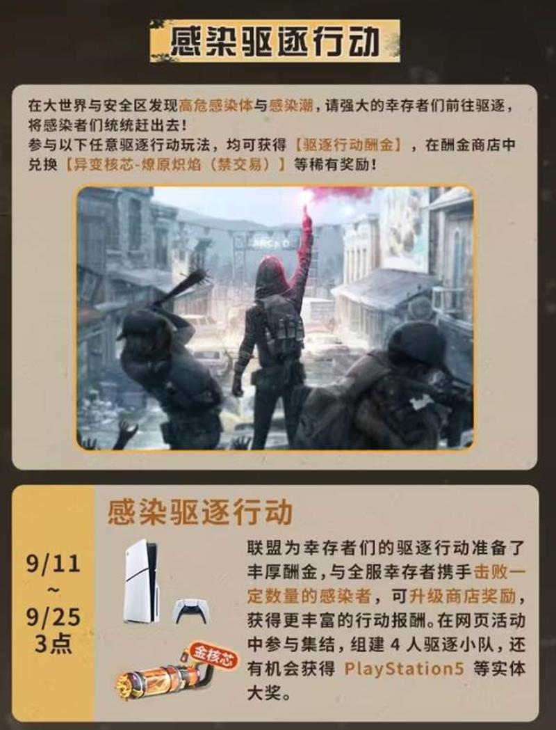 感染驱逐行动(9月11日至9月25日)玩家可以通过参与驱逐行动获得丰厚奖励,包括驱逐行动酬金和稀有奖励如异变核芯、燎原炽焰等。