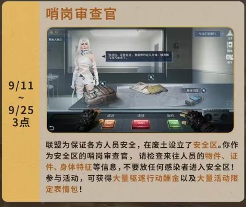 哨岗审查官(9月11日至9月25日)作为安全区的哨岗审查官,玩家需要检查来往人员的物件、证件、身体特征等信息,防止感染者进入安全区。