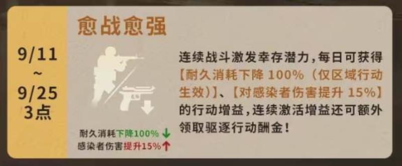 愈战愈强(9月11日至9月25日)连续战斗激发幸存潜力,每日可获得耐久消耗下降100%和对感染者伤害提升15%的行动增益。