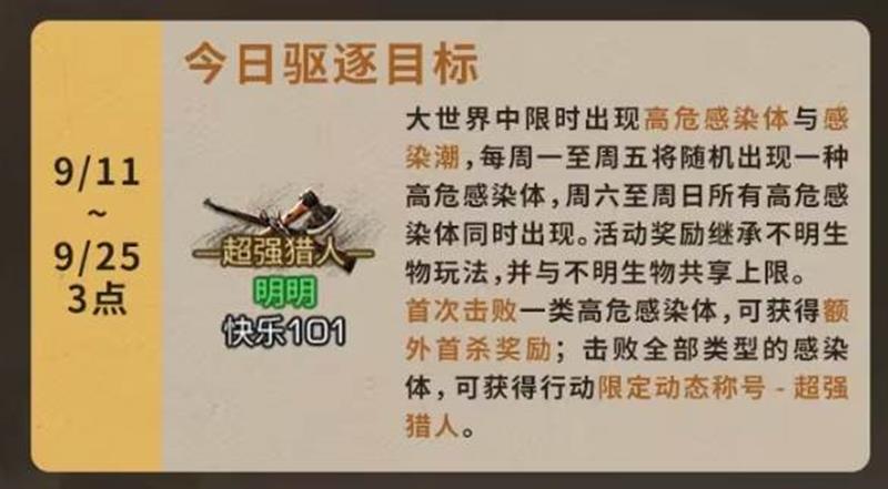 今日驱逐目标(9月11日至9月25日)每周一至周五将随机出现一种高危感染体,首次击败可获得额外奖励。