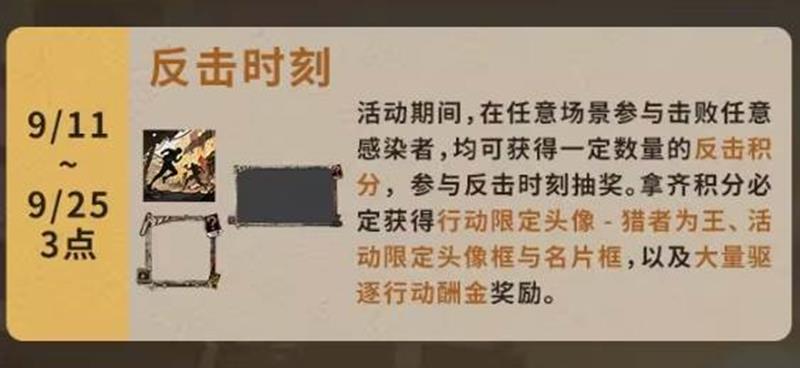 反击时刻(9月11日至9月25日)参与击败任意感染者可获得反击积分,参与反击时刻抽奖。