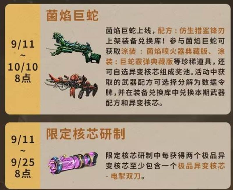 限定核芯研制(9月11日至9月25日)限定核芯研制中每获得两个极品异变核芯至少包含一个极品异变核芯-电弧双刀。