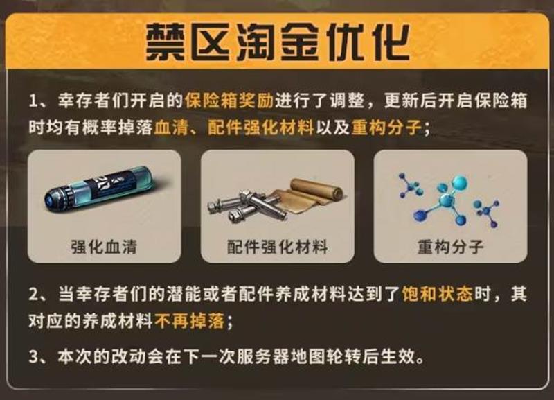 禁区淘宝优化更新后开启保险箱时均有概率掉落血清、配件强化材料及重构分子。