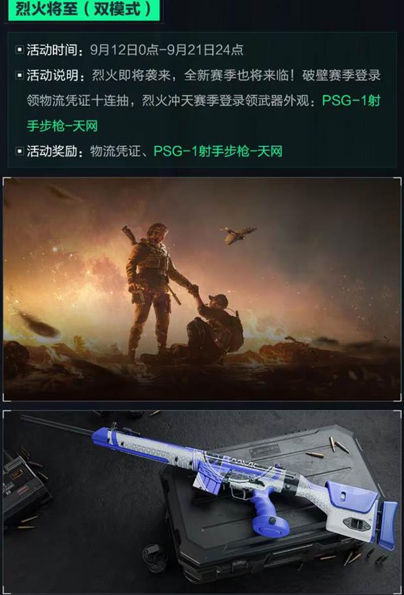 烈火即将袭来,全新赛季也将来临。破壁赛季登录领物流凭证十连抽,烈火冲天赛季登录领武器外观:PSG-1射手步枪-天网。