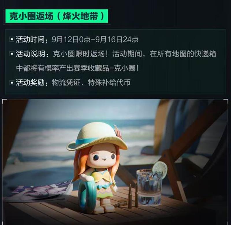 克小圈限时返场。活动期间,在所有地图的快递箱中都将有概率产出赛季收藏品-克小圈。