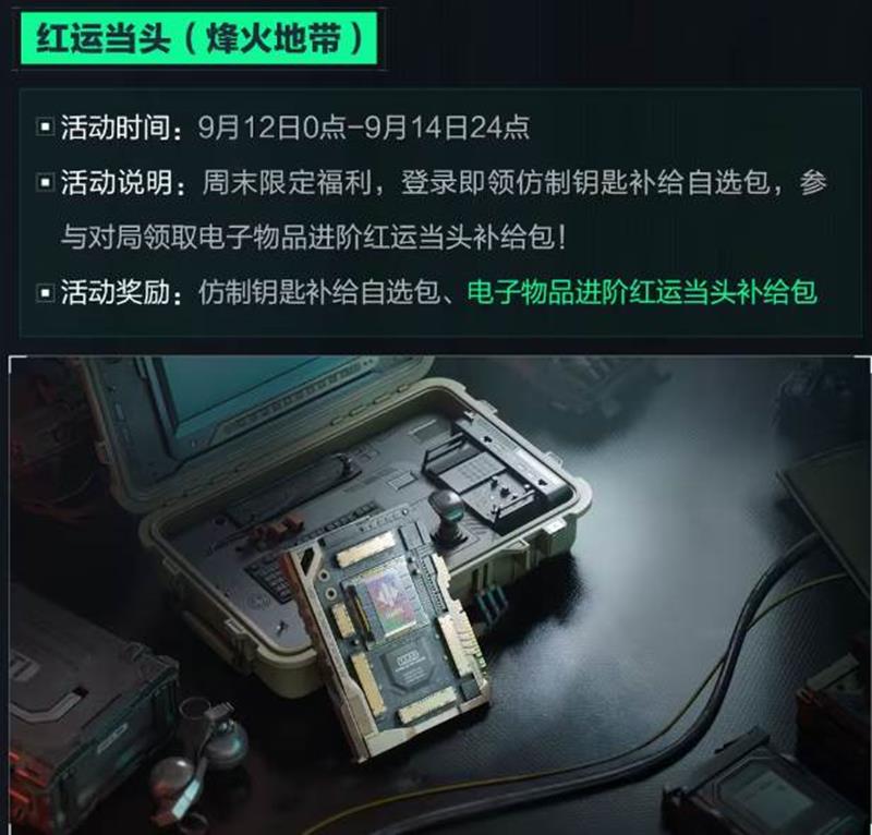 周末限定福利,登录即领仿制钥匙补给自选包,参与对局领取电子物品进阶红运当头补给包。